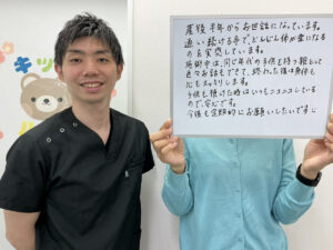 肩こりが辛く通うことにしました。施術は痛みもなく心地よく受けることが出来ました。身体の歪みなどもあるので、今後も定期的に通院して治していきたいと思います。ストレッチなどもやり方教えて頂けたので良かったです!