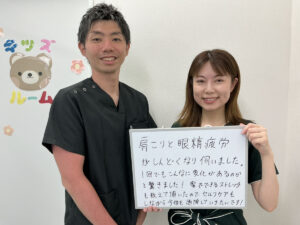 肩こりと眼精疲労がしんどくなり伺いました。1回でもこんなに変化があるのかと驚きました!家でできるストレッチも教えて頂いたので、セルフケアもしながら今後も通院していきたいです!